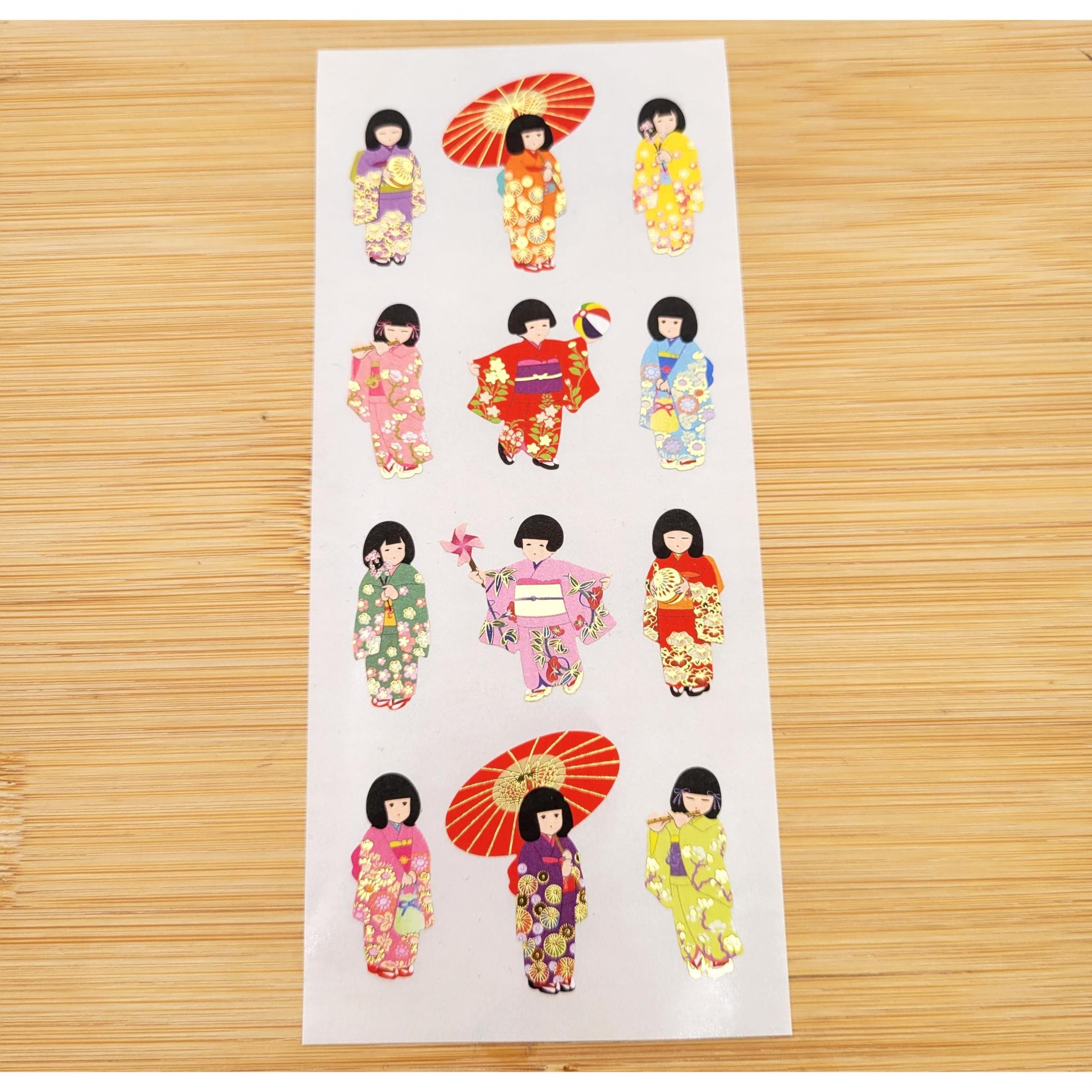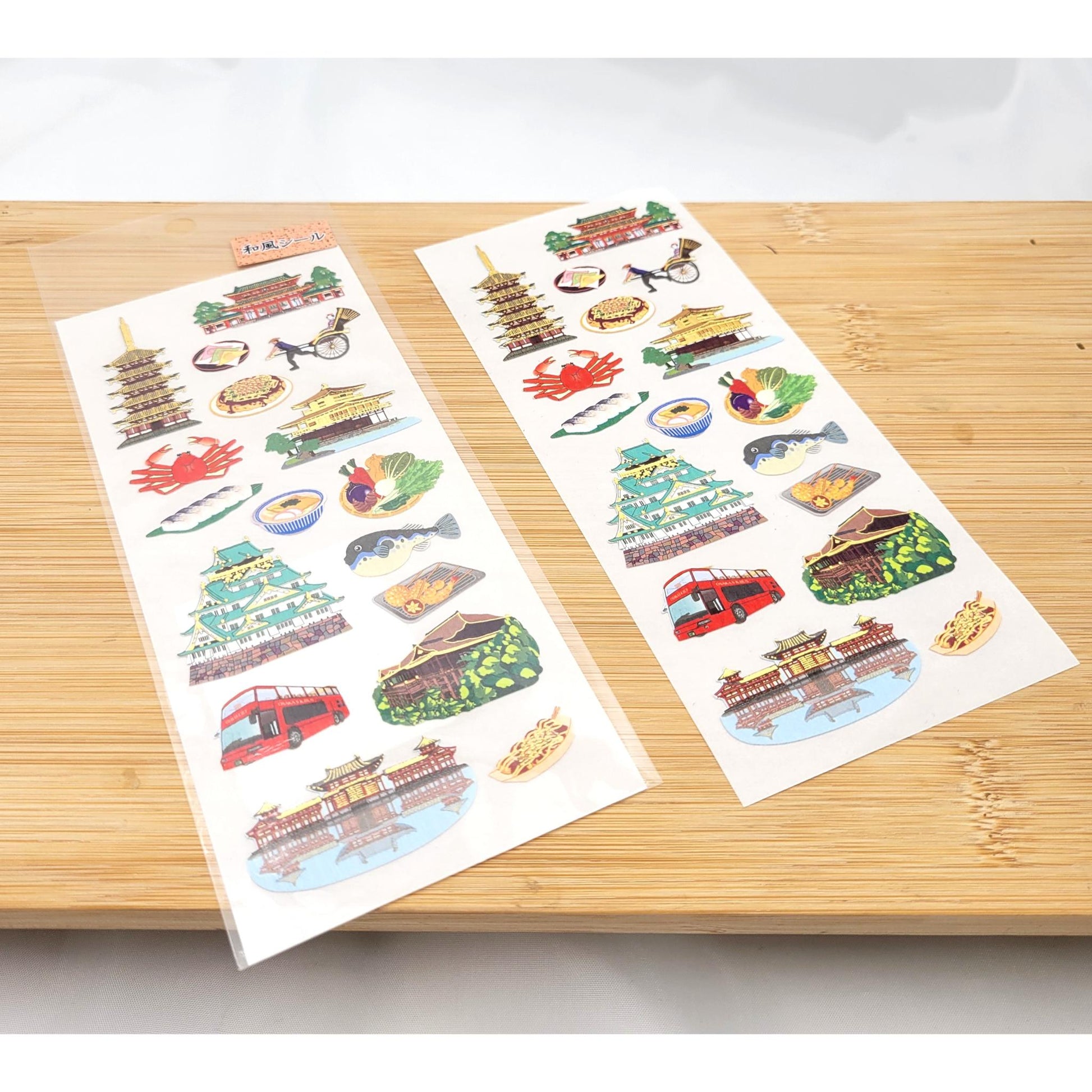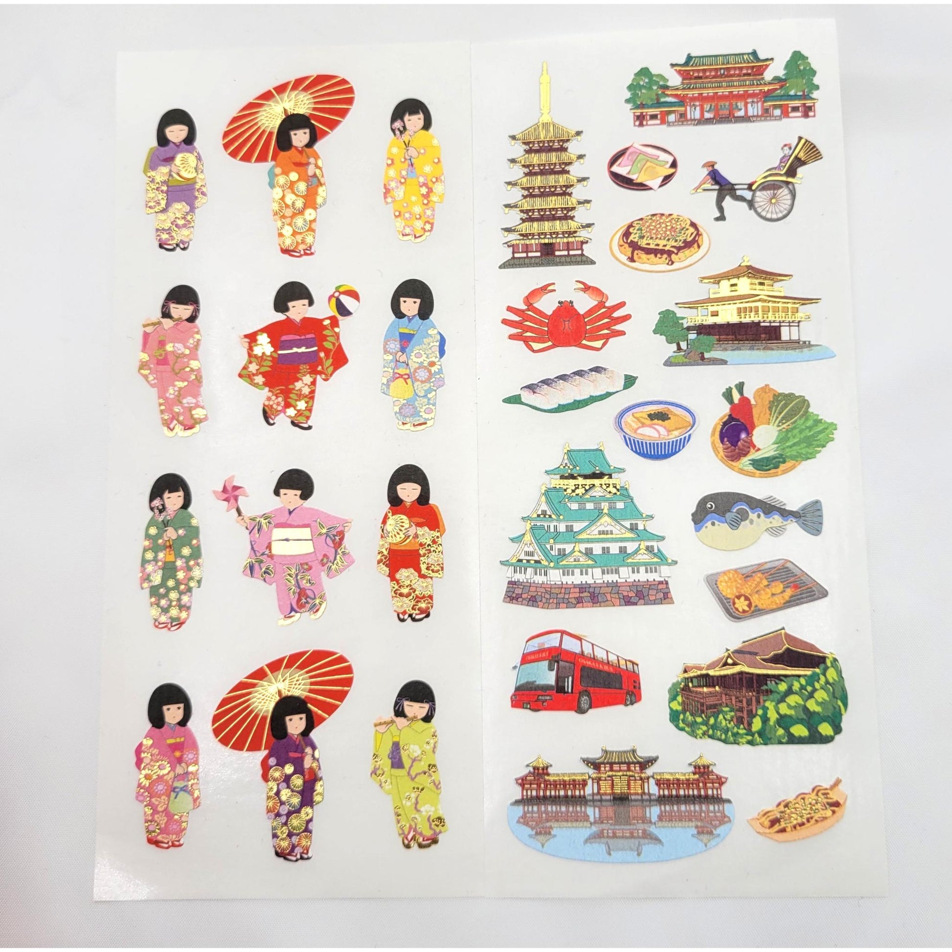 A sheet of stickers with Japanese motifs depicting young women in kimonos, traditional parasols, temples, castles, landscapes, culinary specialties, and iconic modes of transport, ideal for decorating diaries, notebooks, letters, or gift wrapping with a touch of Japanese culture.