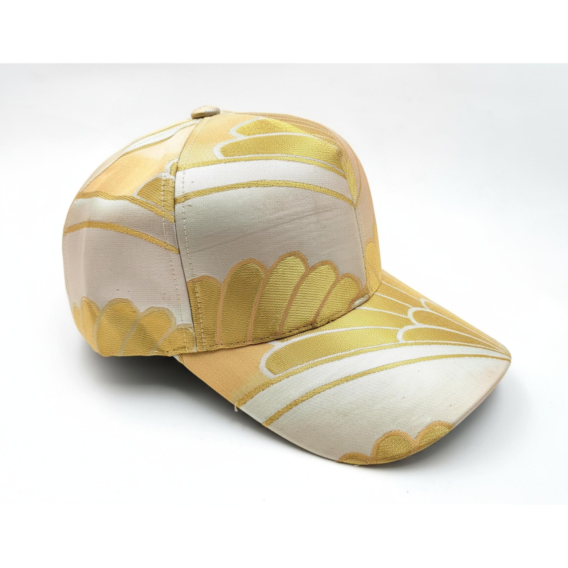 This cap is distinguished by a stylized chrysanthemum (kiku) motif , presented in gold and ivory tones, with soft, radiating lines reminiscent of unfurled petals. The gold threads subtly capture the light, highlighting the floral structure of the motif and the refined weave.