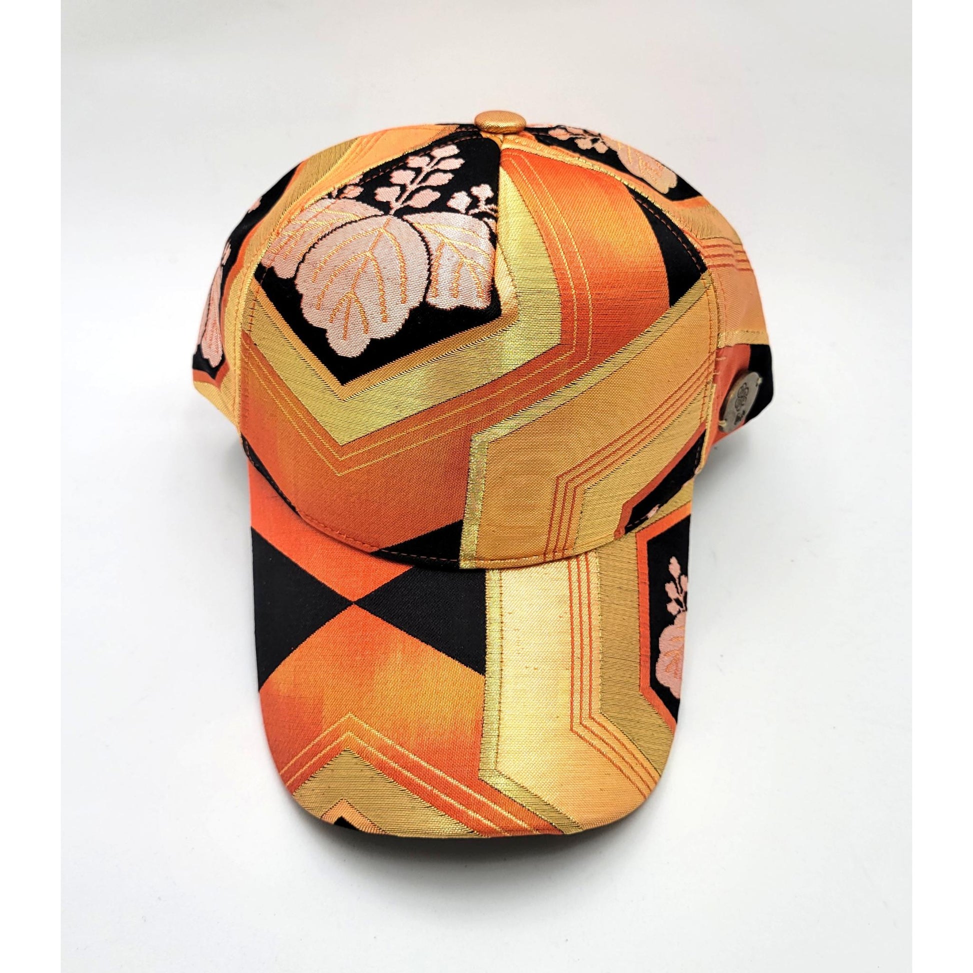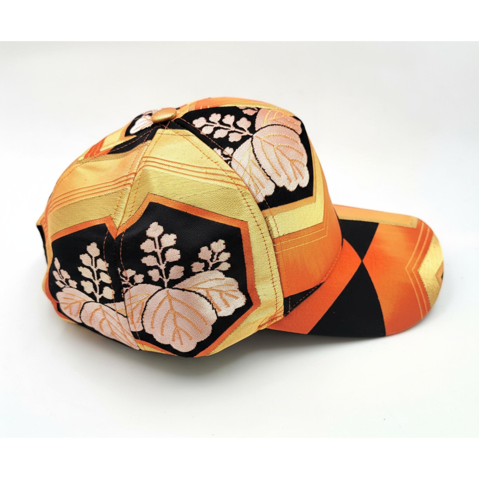 This cap showcases a stylized traditional Japanese floral motif , woven in light ivory , which stands out elegantly against a deep black background . The flowers are integrated into a structured geometric composition, blending gold, orange, and ochre , with clean, angular lines characteristic of formal Japanese textiles.