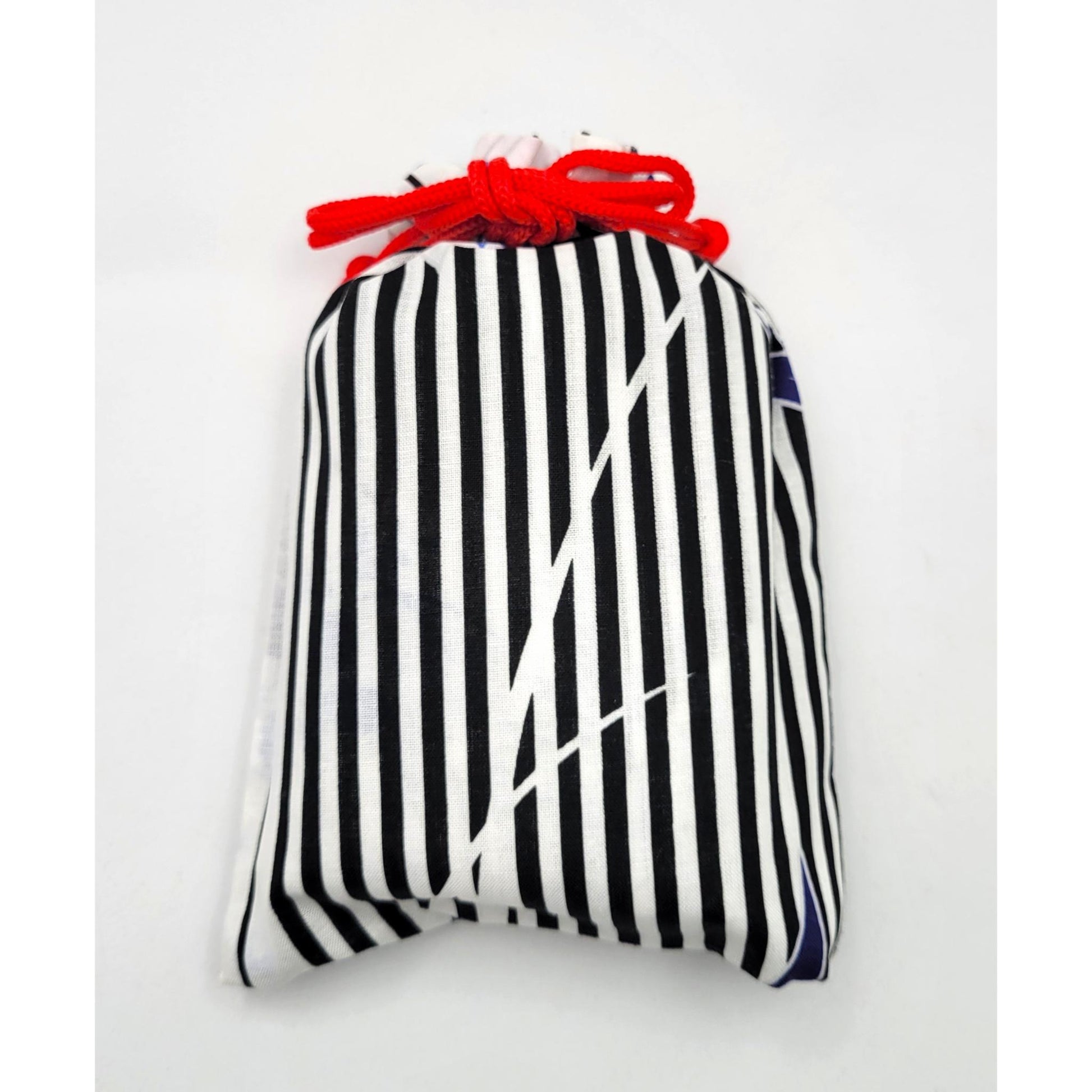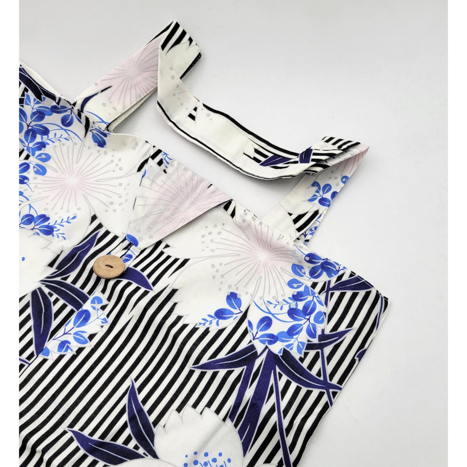 Available in 7 designs : black and white striped with flowers, navy blue with blue flowers, light blue and navy blue with alternating squares, white with blue flowers and red cord, white with blue flowers and pink cord, blue with geometric pattern, white with navy blue flowers.